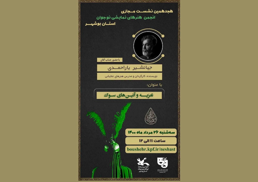 به گزارش روابط‌ عمومی اداره کل کانون پرورش فکری کودکان و نوجوانان استان بوشهر، هجدهمین نشست مجازی انجمن هنرهای نمایشی استان بوشهر باتوجه به ایام محرم با عنوان تعزیه و آیین سوگ و دعوت از جهانشیر یاراحمدی نویسنده، کارگردان و مدرس هنرهای نمایشی، اعضا و مربیان علاقه‌ مند برگزار شد.