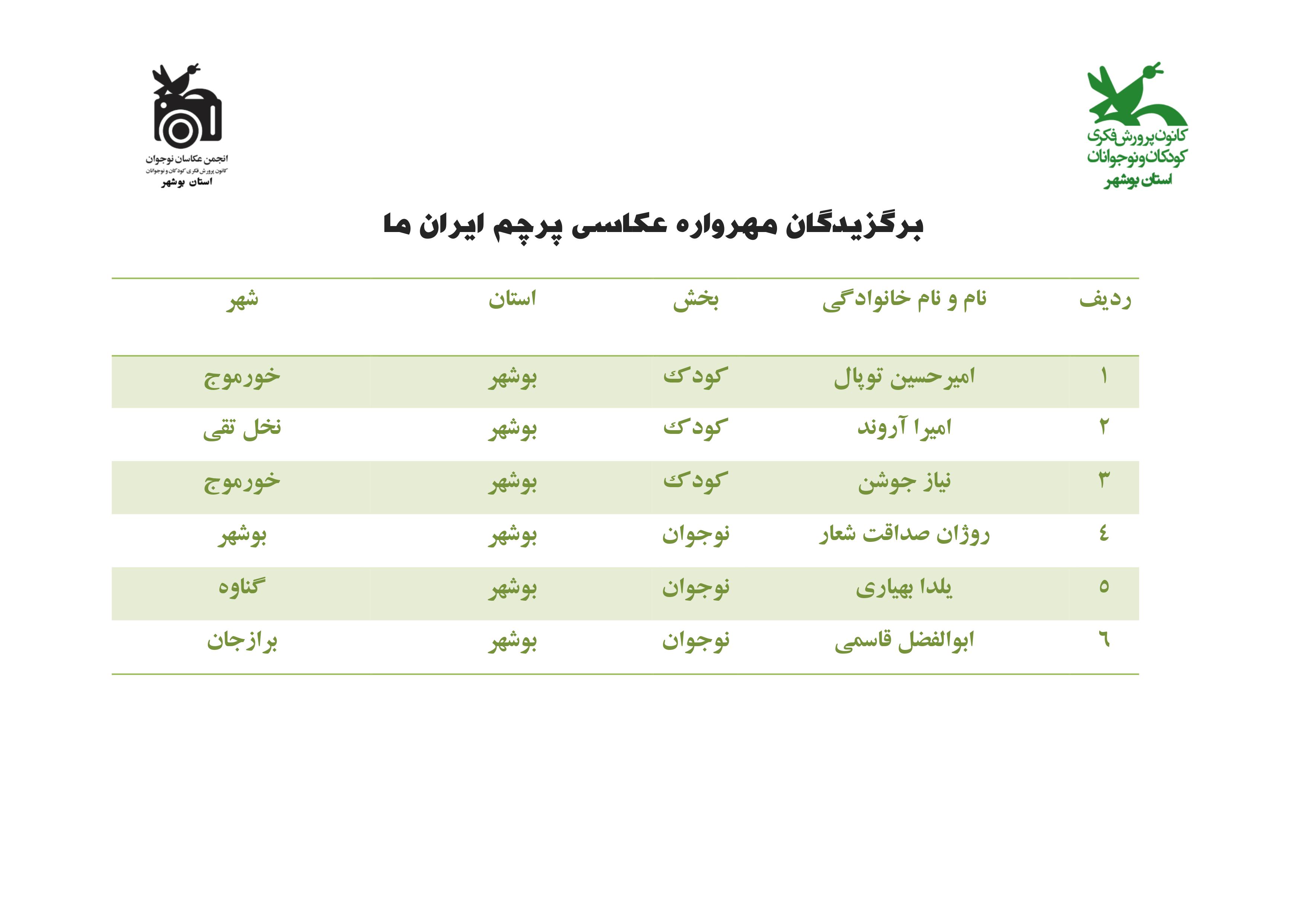 برگزیدگان مهرواره عکاسی "پرچم ایران ما" که توسط انجمن عکاسان نوجوان کانون بوشهر برگزار شده بود معرفی شدند.